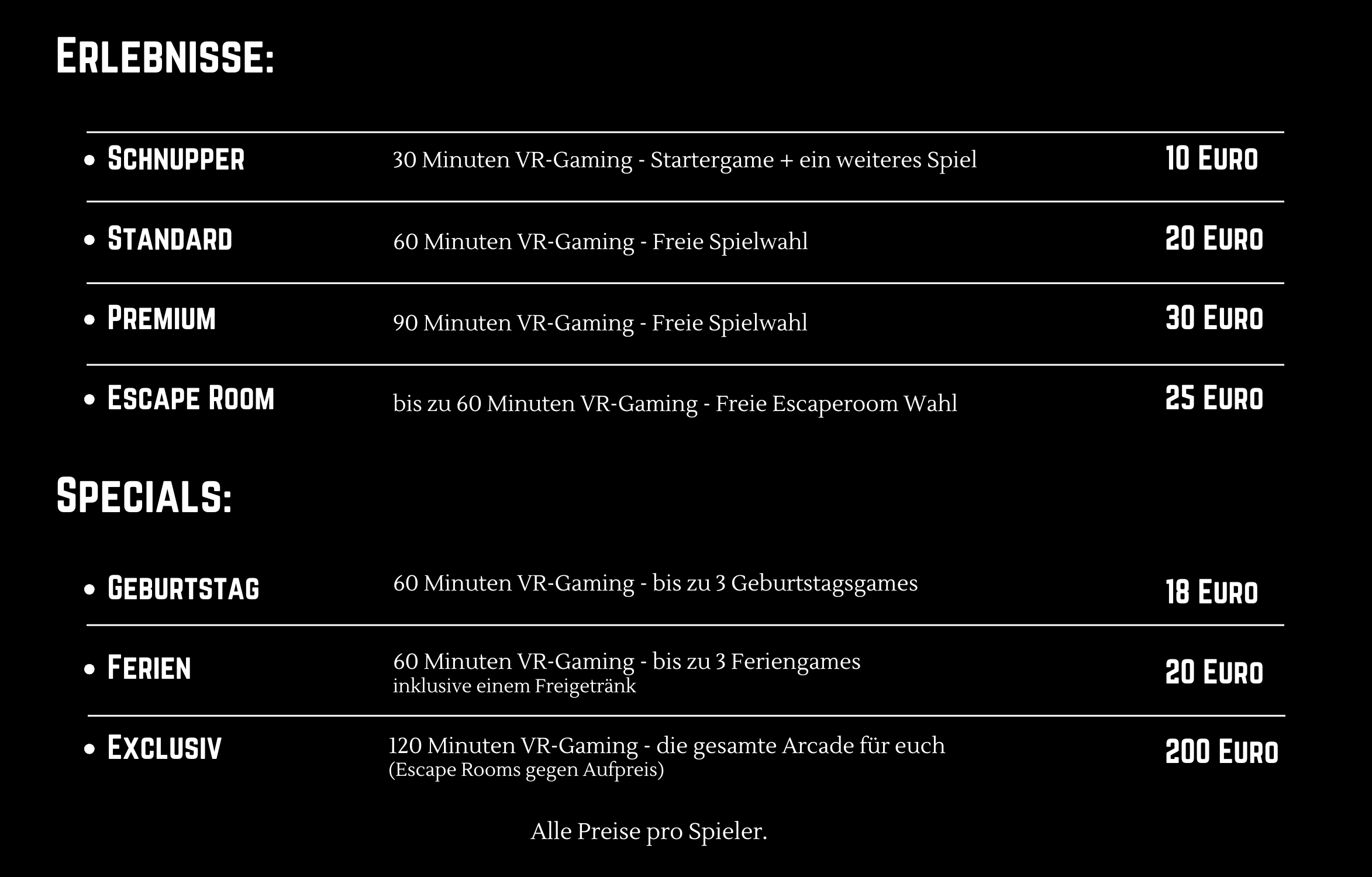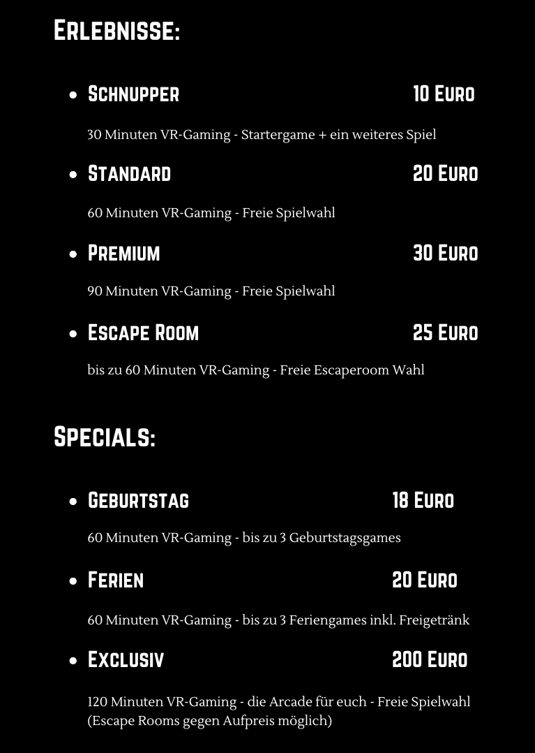 Die Nutzung der VR-Brillen erfolgt auf eigene Gefahr. Der Teilnehmer bestätigt mit der Buchung, dass:Sicherheitsbestimmungen